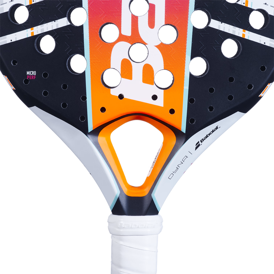 Padel rakete, kas laukumā ātri izceļas ar savām spilgtajām krāsām – uz balta fona raketes centrā saplūst oranžs un rozā tonis. Kā papildu bonuss, rokas siksniņu var viegli noņemt un nomainīt atbilstoši savām vajadzībām un vēlmēm. Vidējais līdzsvars atbalsta daudzpusīgu spēles stilu.