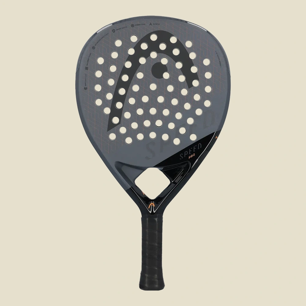 Head Speed Pro 2023 ir augstākā līmeņa padela rakete, kas apvieno mūsdienīgu dizainu un lielisku spēlējamību. Spīdīgā apdare ar vara un melnām detaļām uz tumši pelēka fona piešķir raketei elegantu un profesionālu izskatu, kas izceļas laukumā.
