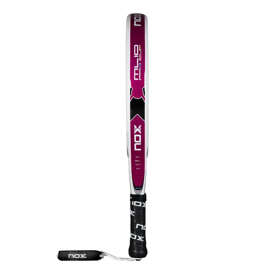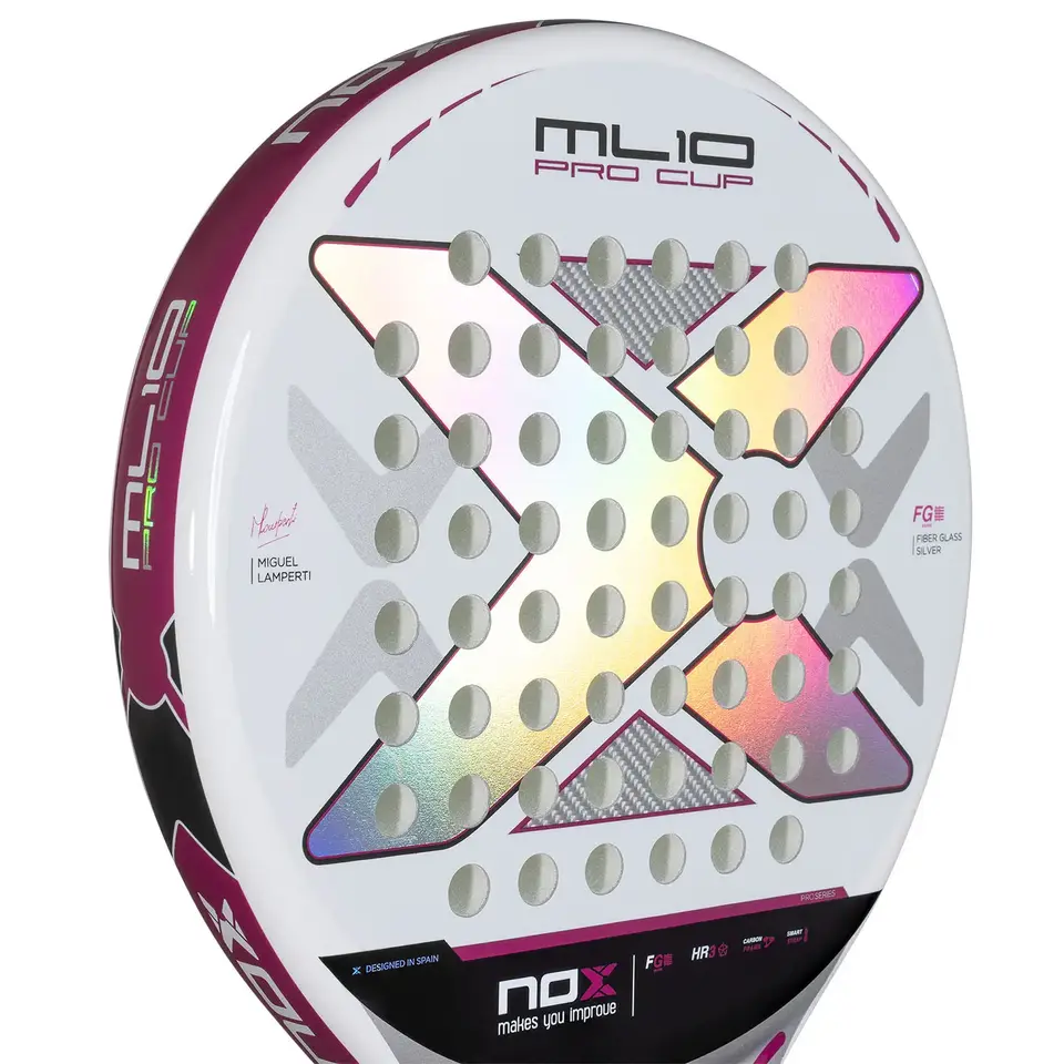 Nox ML10 Pro Cup Silver 2025 ir Migela Lamperti oficiālā padel rakete – ideāla izvēle spēlētājiem, kuri meklē perfektu līdzsvaru starp vieglumu un jaudu. Regulētais svars no 360 līdz 375 g padara šo modeli īpaši viegli vadāmu un ērtu, vienlaikus saglabājot šai leģendārajai sērijai raksturīgo stabilitāti. Apaļā forma nodrošina lielu sitiena laukumu (sweet spot), kas piedāvā izcilu kontroli katrā sitienā. Oglekļa rāmis un stikla šķiedras virsma ar metālisku apdari rada izturīgu kombināciju ar labu bumbas izlidošanu.